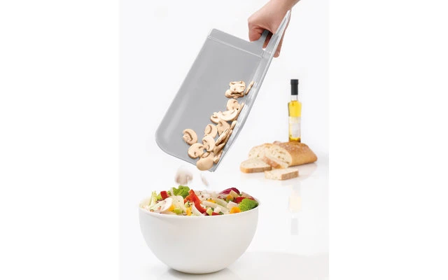 Erst schneiden, dann falten. Der Archetyp des Schneidbretts jetzt mit neuer Klappfunktion und durchdachtem Design. Das Schneidebrett lässt sich durch den mittigen Falz anwinkeln und das geschnittene Gut rutscht sicher in den Topf oder die Schüssel. Dank seiner professionellen Größe lassen sich bei der Speisenzubereitung alle Zutaten bequem auf einer Fläche zerkleinern und sammeln. Auch Braten oder Backwaren werden hier komfortabel portioniert. Mit dem großem Griff zum besseren Anheben und Halten, der rundum laufenden Saftrille und seiner klingenschonender Oberfläche ist SNAP 2.0 einfach gut durchdacht. Das Schneidebrett wird aus dem neuen koziol Organic Material mit natürlicher Zellulose hergestellt: umweltfreundlich, lebensmittelecht, 100% recycelbar, absolut schadstofffrei, ohne Formaldehyd oder BPA. Dazu ist es extrem langlebig, robust und natürlich spülmaschinenfest. Die Herstellung in Deutschland ermöglicht zudem eine aktive Reduktion von CO² durch kurze Transportwege und den Einsatz von Ökostrom.