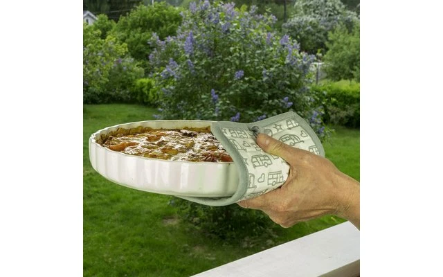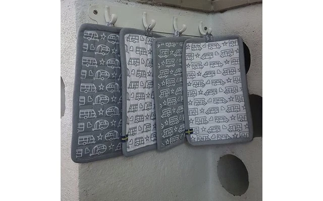 Pufz Topflappen mit zwei verschiedenen Mustern (Wohnwagen/Wohnmobil), einmal weiß auf grau und einmal grau auf weiß.