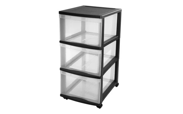 Die drei Schübe bestehen aus transparentem Kunststoff, der Rahmen des Schubladensystems aus sehr edel wirkendem Schwarz.