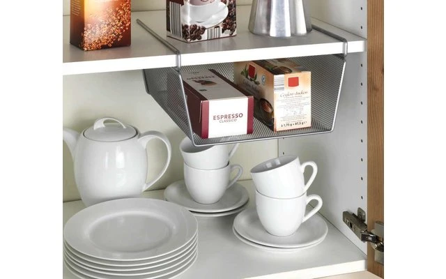Dieser praktische Regaleinhängekorb aus Metall wird einfach an einen Regal- oder Schrankboden eingehängt. So schafft der Ablagekorb zusätzlichen Stauraum in Küche, Schlafzimmer und im gesamten Haushalt.